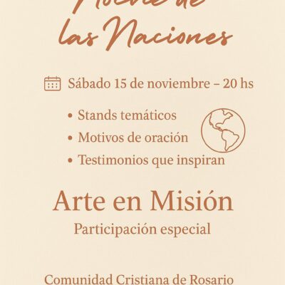 El sábado 15 de noviembre a las 20hs, se realizará el evento «Noche de las Naciones» en Comunidad Cristiana de Rosario. Participará Arte en Misión, […]